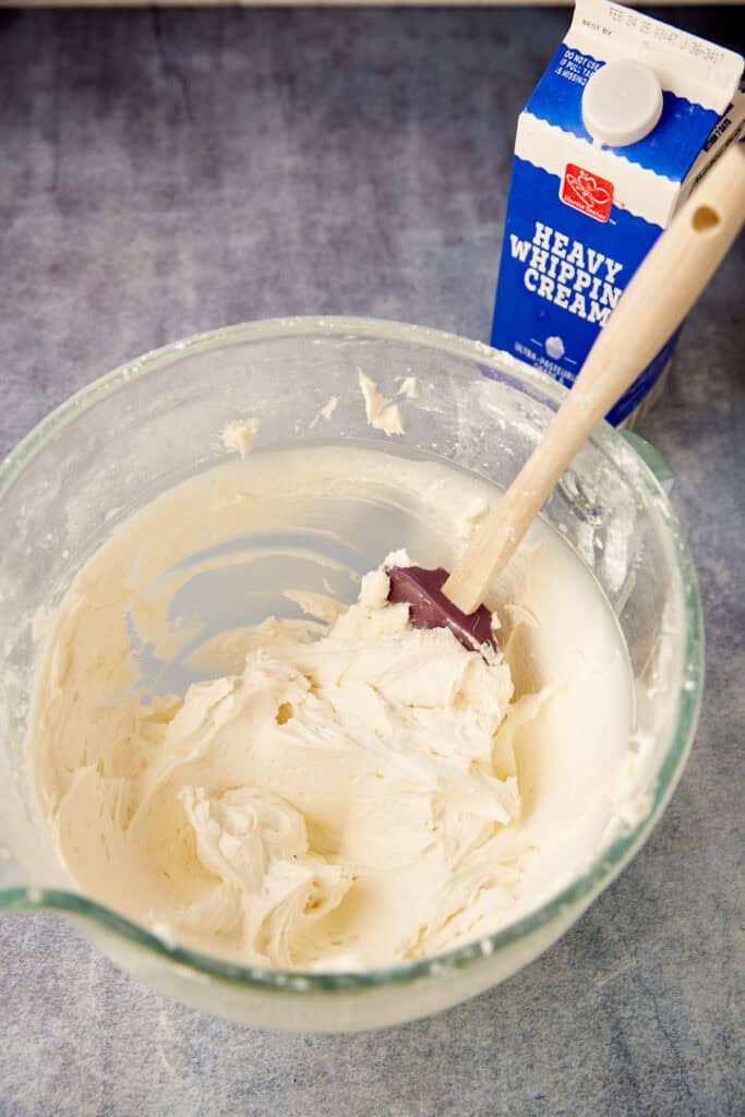 Slowly mix in cream until the frosting is light, fluffy, and easy to spread or pipe. Chill briefly if needed before decorating.